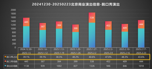 2025年开年,北京线下商业演出市场便迎来了一波热潮,话剧、芭蕾舞剧、相声、儿童剧等数十种剧种轮番上演。值得注意的是,根据北京市文化和旅游局公布的2024年12月30日至2025年2月23日《北京商业演出信息》统计,脱口秀演出数量占比一直居高不下,以总场数3438场占据了所有商业演出的42.8%。